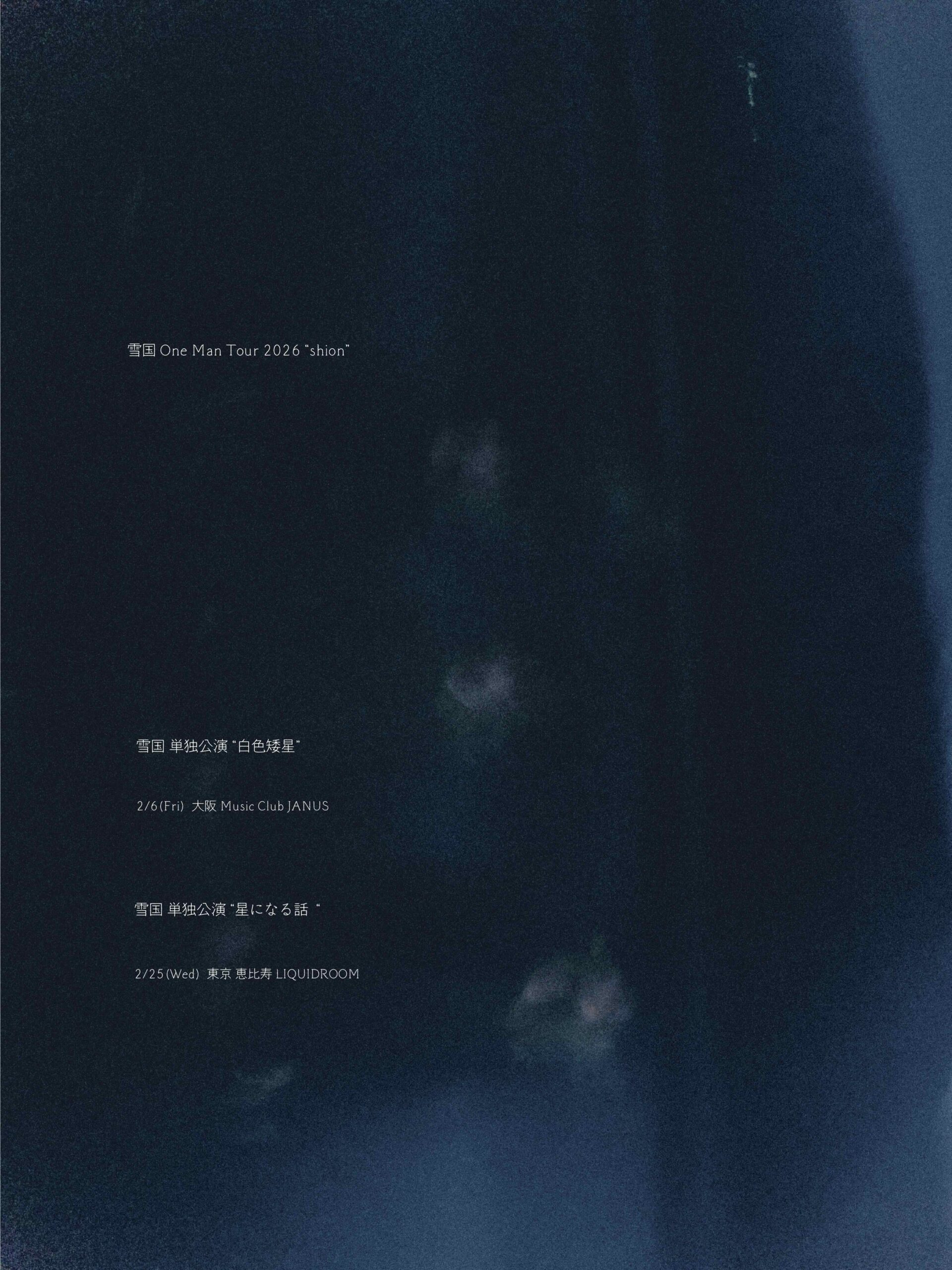 02/ 06 FRI 雪国 One Man Tour 2026 “shion” 2/6 雪国 単独公演 「白色矮星」 雪国 OPEN/START 18:30 / 19:00 ADV/DOOR ¥4,500 / 未定 TICKET 2025/12/27発売 ぴあ・ローソン・e+ INFORMATION 06-6357-4400 ( サウンドクリエーター ) MORE INFORMATIONS U-20キャッシュバックあり(¥500)