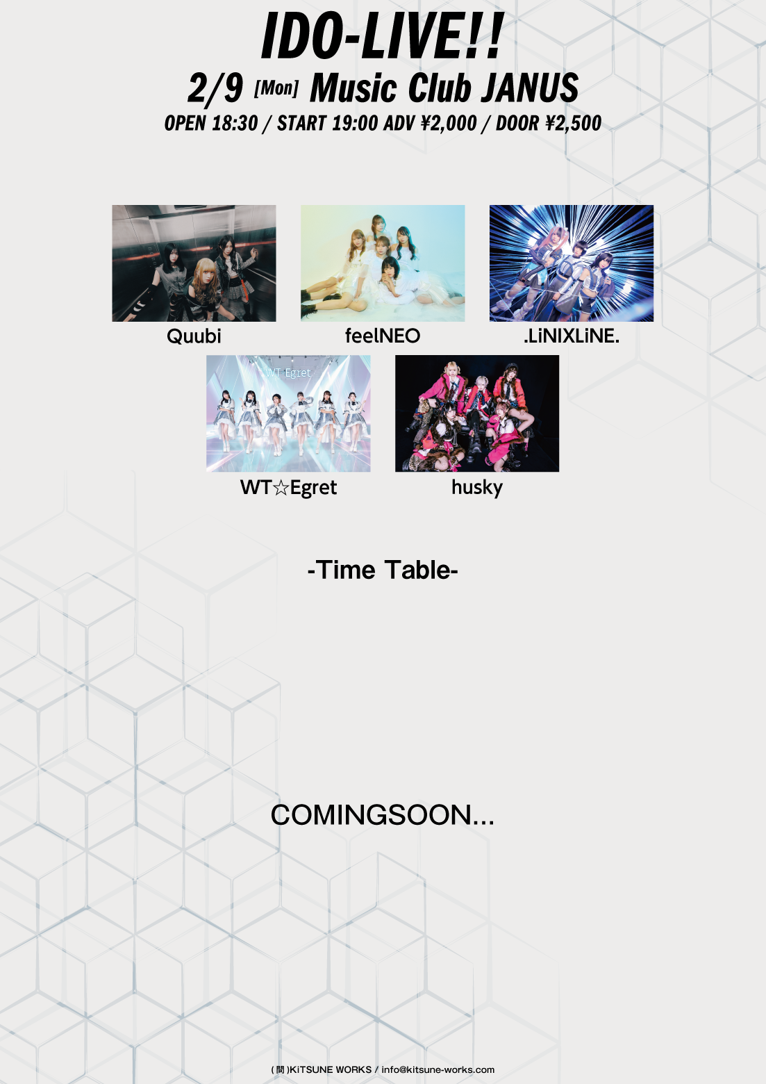 02/ 09 MON IDO-LIVE!! Quubi / .LiNIXLiNE. / feelNEO / WT☆Egret / husky OPEN/START 18:30 / 19:00 ADV/DOOR ¥2,000 / ¥2,500 TICKET 2026/01/30発売 e+ INFORMATION info@kitsune-works.com ( KiTSUNE WORKS )