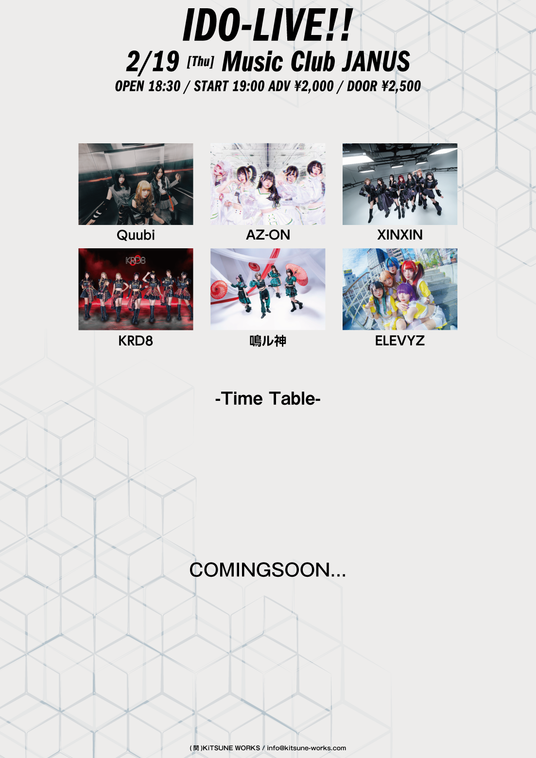 02/ 19 THU IDO-LIVE!! Quubi / AZ-ON / 鳴ル神 / ELEVYZ / KRD8 / XINXIN OPEN/START 18:30 / 19:00 ADV/DOOR ¥2,000 / ¥2,500 TICKET 2026/01/30発売 e+ INFORMATION info@kitsune-works.com ( KiTSUNE WORKS )