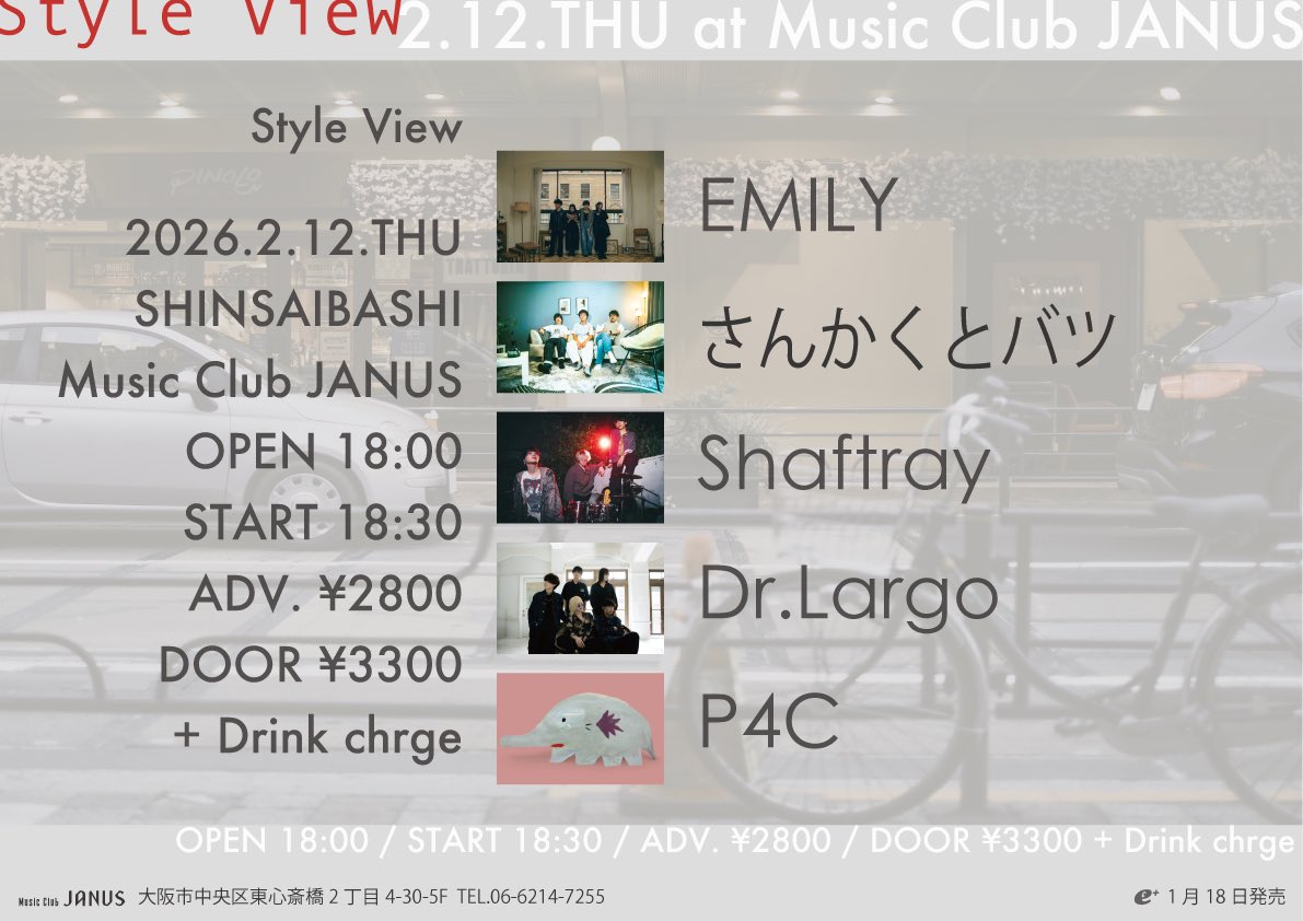 02/ 12 THU Style View EMILY / さんかくとバツ / Shaftray / Dr.Largo / P4C OPEN/START 18:00 / 18:30 ADV/DOOR ¥2,800 / ¥3,300 TICKET 2026/01/18発売 JANUS・e+ INFORMATION 06-6214-7255 ( JANUS ) MORE INFORMATIONS 1/18 (日) 13:00~「JANUSチケット」の電話予約 (06-6214-7255) 開始 引き換え等の方法はお電話にてお伝えいたします。