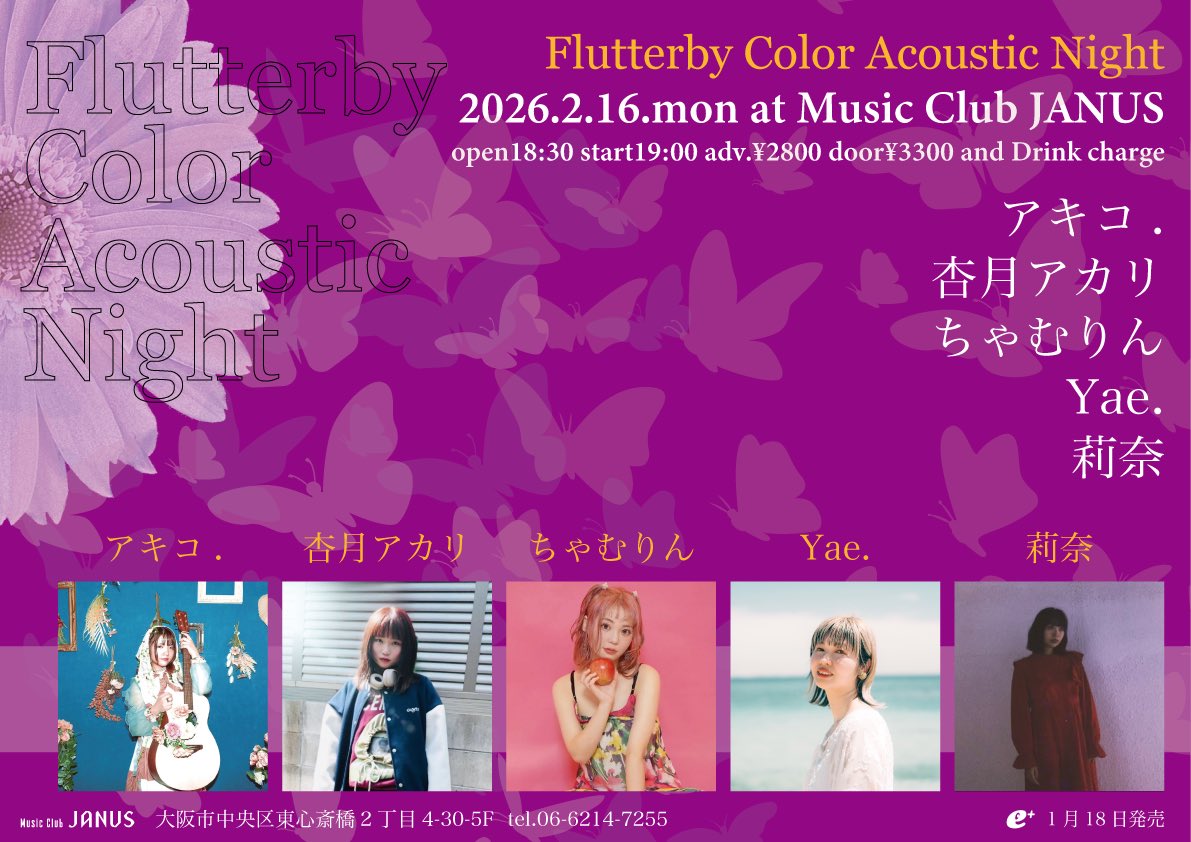 02/ 16 MON Flutterby Color Acoustic Night アキコ. / 杏月アカリ / ちゃむりん / Yae. / 莉奈 OPEN/START 18:30 / 19:00 ADV/DOOR ¥2,800 / ¥3,300 TICKET 2026/01/18発売 JANUS・e+ INFORMATION 06-6214-7255 ( JANUS ) MORE INFORMATIONS 1/18 (日) 13:00~「JANUSチケット」の電話予約 (06-6214-7255) 開始 引き換え等の方法はお電話にてお伝えいたします。