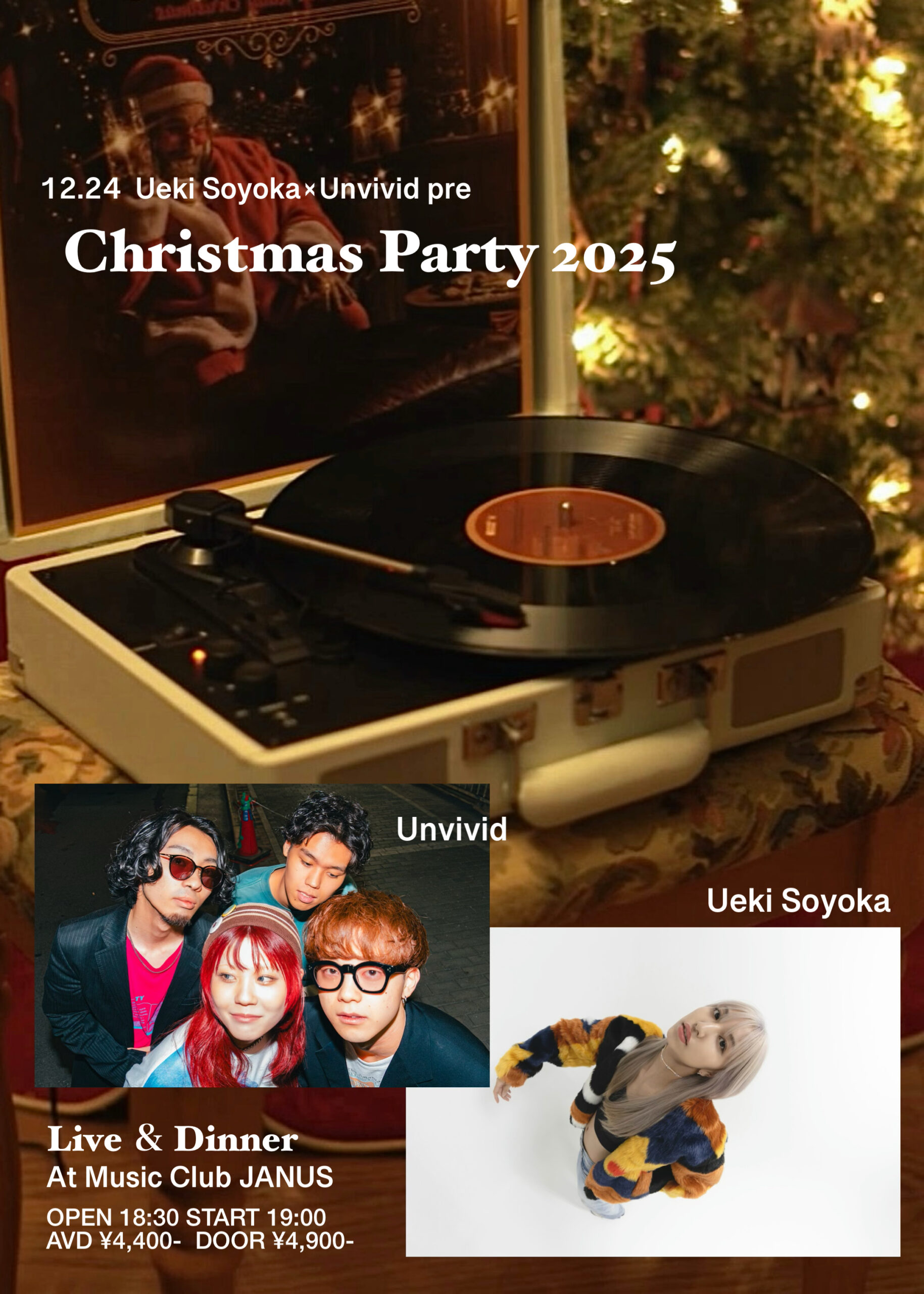 12/ 24 WED Ueki Soyoka×Unvivid pre. “Christmas Party 2025” Ueki Soyoka / Unvivid OPEN/START 18:30 / 19:00 ADV/DOOR ¥4,400 / ¥4,900 TICKET 2025/11/04発売 JANUS・e+ INFORMATION 06-6214-7255 ( JANUS ) MORE INFORMATIONS 11/4 (火) 13:00~「JANUSチケット」の電話予約 (06-6214-7255) 開始 引き換え等の方法はお電話にてお伝えいたします。