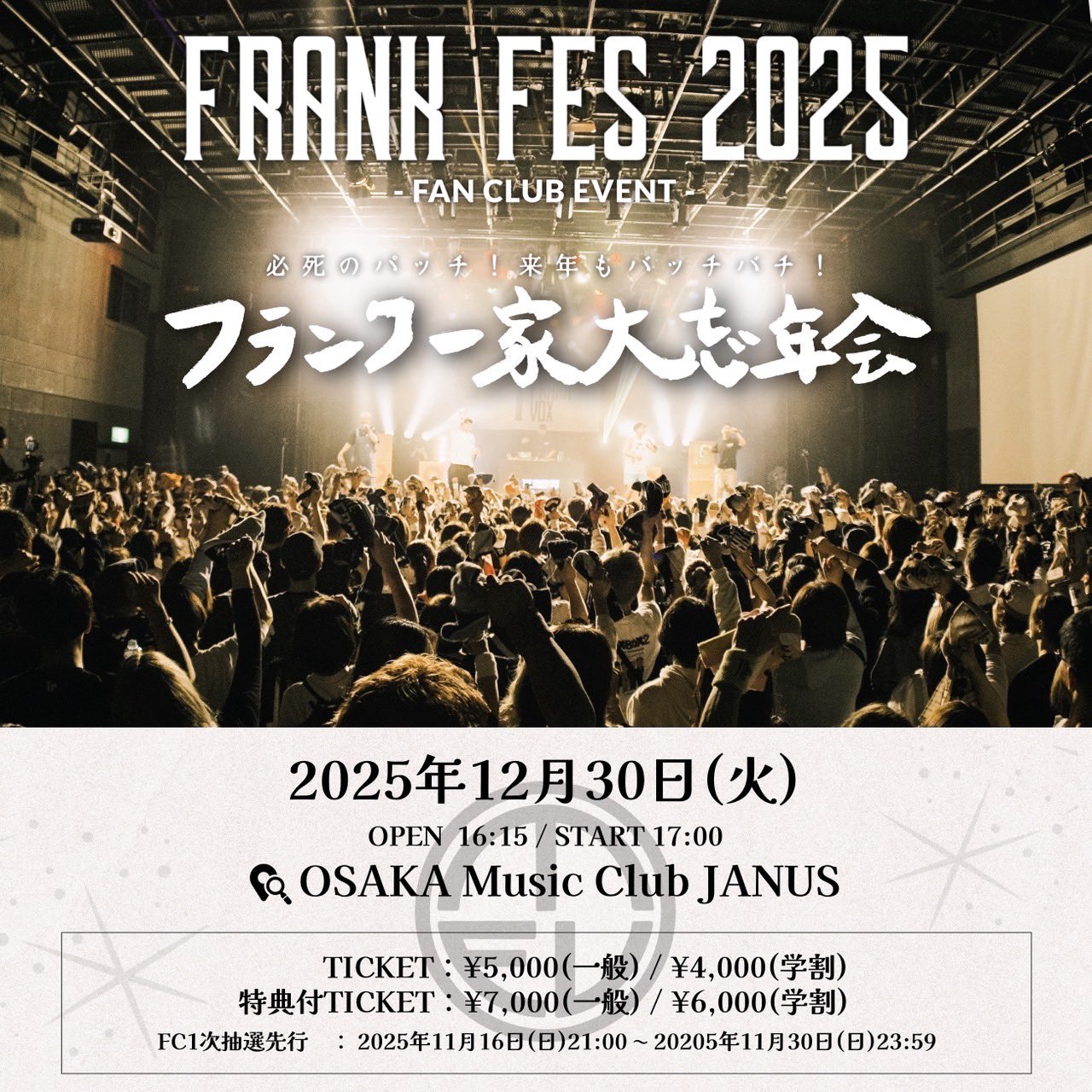 12/ 30 TUE FRANK FES 2025 必死のパッチ!来年もバッチバチ! フランク一家大忘年会 THE FRANK VOX OPEN/START 16:15 / 17:00 ADV/DOOR ¥5,000 / 未定 学割/特典付き/学割(特典付き) ¥4,000 / ¥7,000 / ¥6,000 TICKET FCのみ INFORMATION 06-6214-7255 ( JANUS ) MORE INFORMATIONS <学割チケットについて> 入場時に学生証をご提示ください。 学生証をお忘れの場合は一般料金(差額)をお支払いいただくことがございます。 学割対象者は小学生・中学生・高校生・高等専門学校生・専門学生・ 短大・大学生・大学院生が対象となります。 小学生は年齢を証明できるものを、中学生以上の方は学生証をご持参ください。