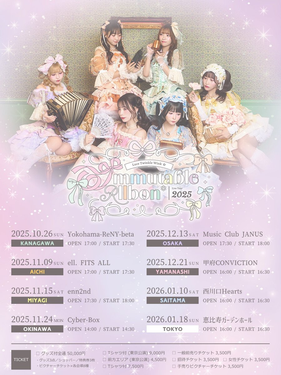 12/ 13 SAT Luce Twinkle Wink☆Live Tour2025 〜Immutable RIIbon*〜 Luce Twinkle Wink☆ OPEN/START 17:30 / 18:00 ADV/DOOR ¥3,500 / ¥4,500 Tシャツ付きチケット/女性/招待チケット/グッズ付き全通チケット ¥7,500 / ¥3,500 / ¥50,000 TICKET Ticket Dive INFORMATION info@arcjewel.com ( アークジュエル )