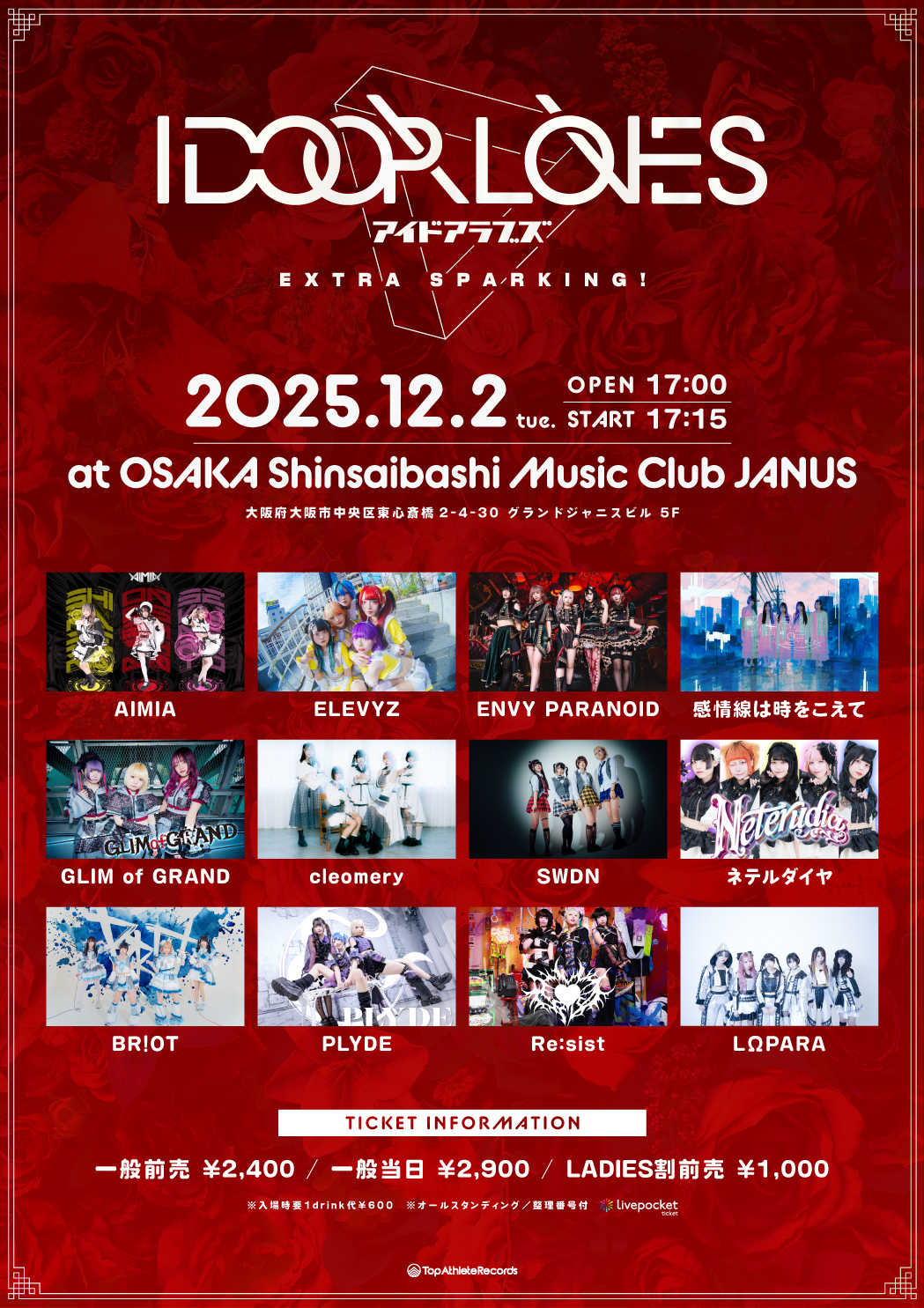 12/ 02 TUE "IDOORLOVERS" -EXTRA SPARKING!- AIMIA / ELEVYZ / ENVY PARANOID / 感情線は時をこえて / GLIM of GRAND / cleomery / SWDN / ネテルダイヤ / BR!OT / PLYDE / Re:sist / LΩPARA OPEN/START 17:00 / 17:15 ADV/DOOR ¥2,400 / ¥3,400 U-22 ¥1,000 TICKET 2025/11/19発売 LivePocket INFORMATION ssym@top-athlete.net ( Top Athlete Records )