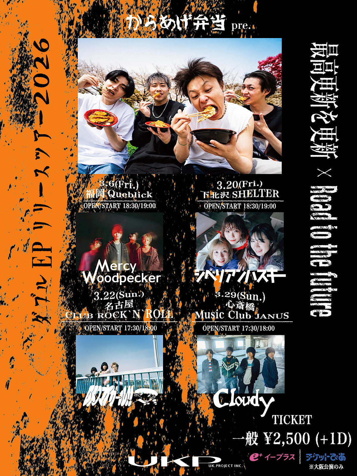 03/ 29 SUN からあげ弁当 pre. ダブルEPリリースツアー2026「最高更新を更新 × Road to the future」 からあげ弁当 対バン:Cloudy OPEN/START 17:30 / 18:00 ADV/DOOR ¥2,500 / 未定 TICKET ぴあ・e+ INFORMATION 06-6882-1224 ( GREENS )