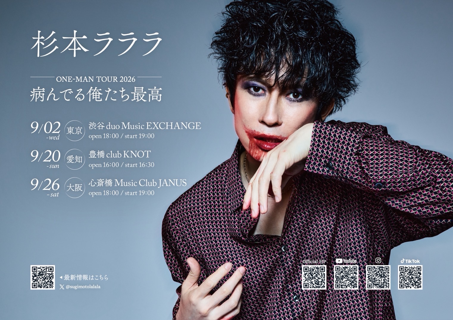 09/ 26 SAT 杉本ラララ ワンマンライブ 「病んでる俺たち最高」 杉本ラララ Support member : 小川徹 / KAZU / 小夜子 / 岸田うらら OPEN/START 18:00 / 19:00 ADV/DOOR ¥4,000 / ¥4,500 TICKET 手売り INFORMATION 06-6214-7255 ( JANUS )